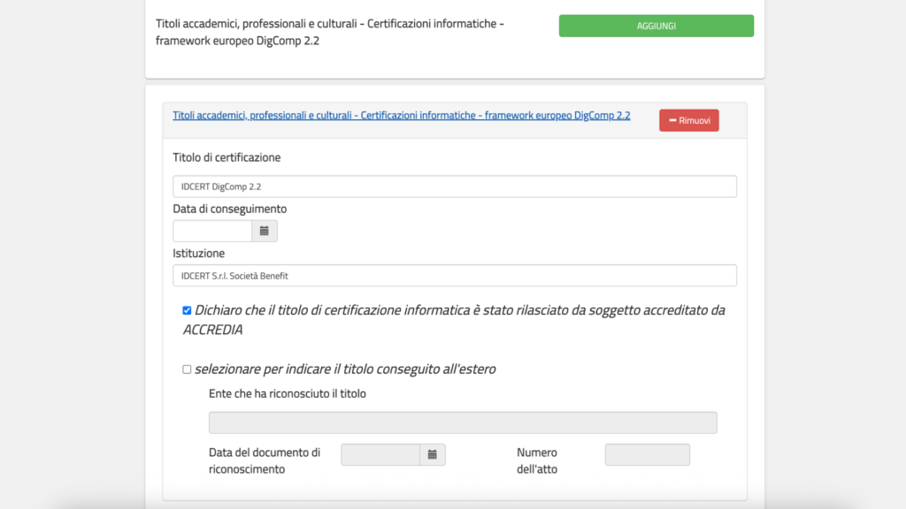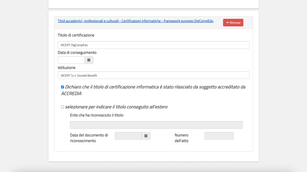 È qui che devi inserire le tue certificazioni IDCERT. La piattaforma ti proporrà una serie di campi da compilare per ogni titolo aggiunto.