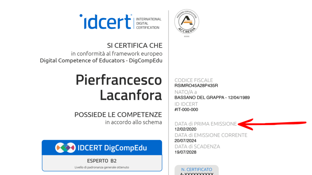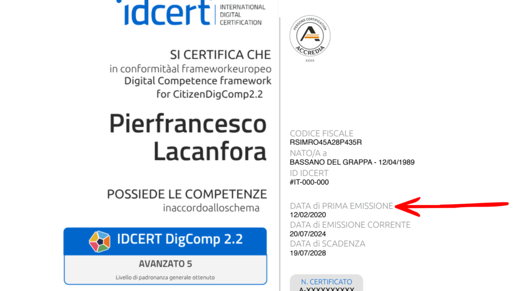 | Data di conseguimento | La “Data di prima Emissione” riportata sul certificato |