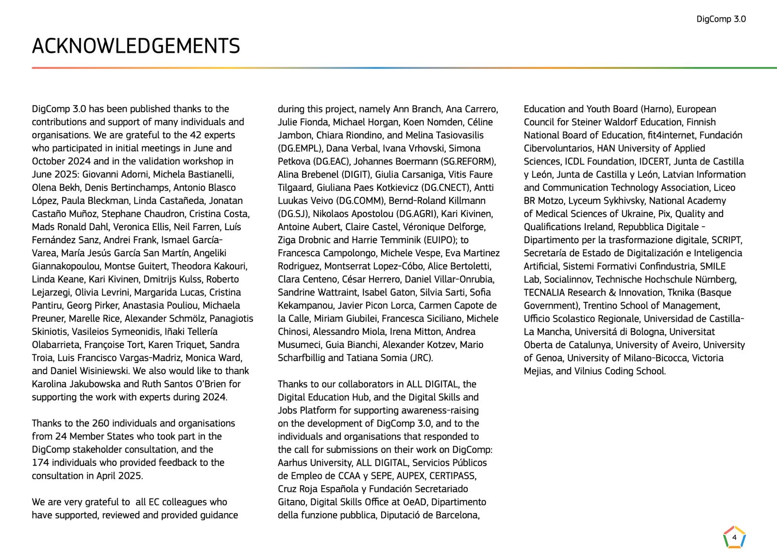 DigComp 3.0 è il risultato del contributo di oltre 300 esperti, organizzazioni e istituzioni provenienti da tutta Europa e oltre. Questo processo di consultazione ampio e strutturato ha garantito che il framework riflettesse una pluralità di prospettive e rispondesse a esigenze concrete provenienti da ambiti diversi: istruzione, formazione professionale, mercato del lavoro, ricerca, politiche pubbliche.